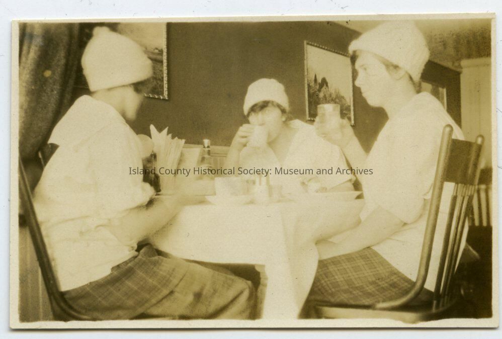 Photo of three young women sitting in a cafe/restaurant, table cloth, pictures on the wall. On the back: Waffles at the minute lunch