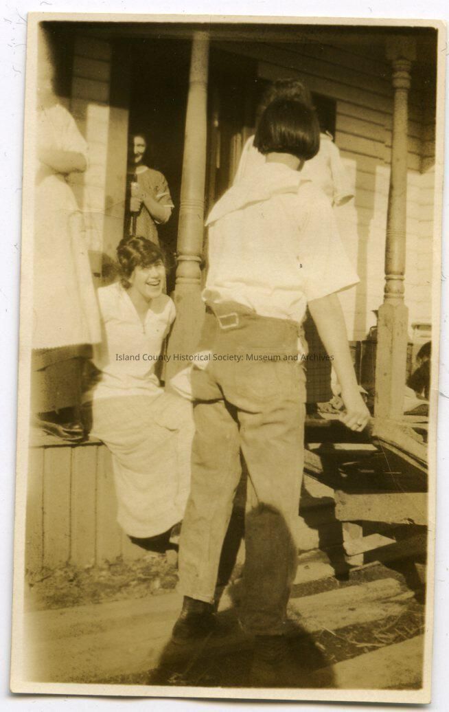 Photo of four young woman sitting/leaning on a porch. On the back: Eva, Mrs. Tyler, Delsie (?), & Vera