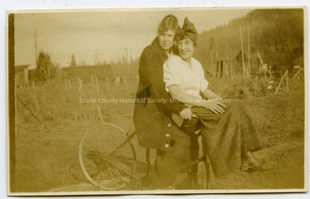 Photo of two young woman on a bicycle, one on the seat, the other on the handle bars. On the back: Jimmie & Buster
