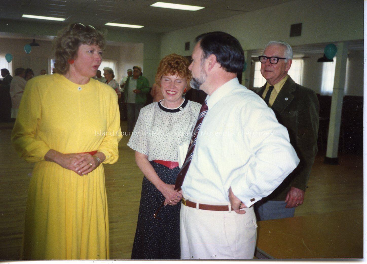 A color photo in the Coupeville recreation hall. A group of 2 women and 2 men are talking in the center of the room. One of the ladies is in a bright yellow dress, and wears glasses. She was in the previous photos.