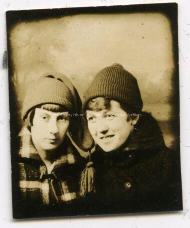 Photo of two young women, both wearing hats and coats. On the back: Harry & I