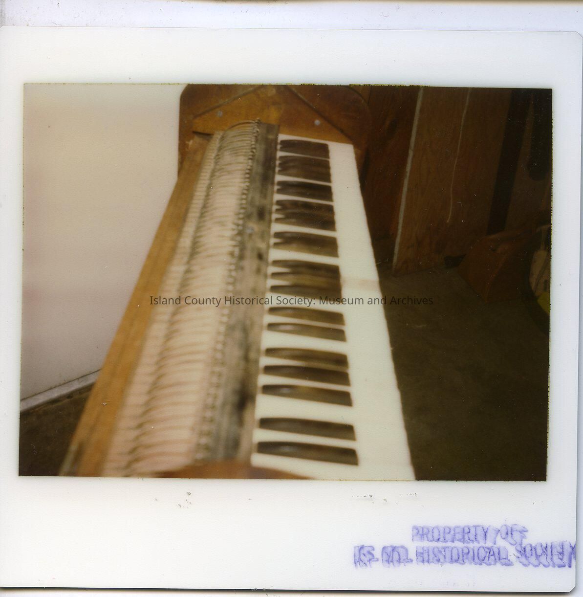A color poloroid photo of the internal parts of an organ. The keyboard is apparently standing separate from the rest of the organ. The keys and hammers are visible.