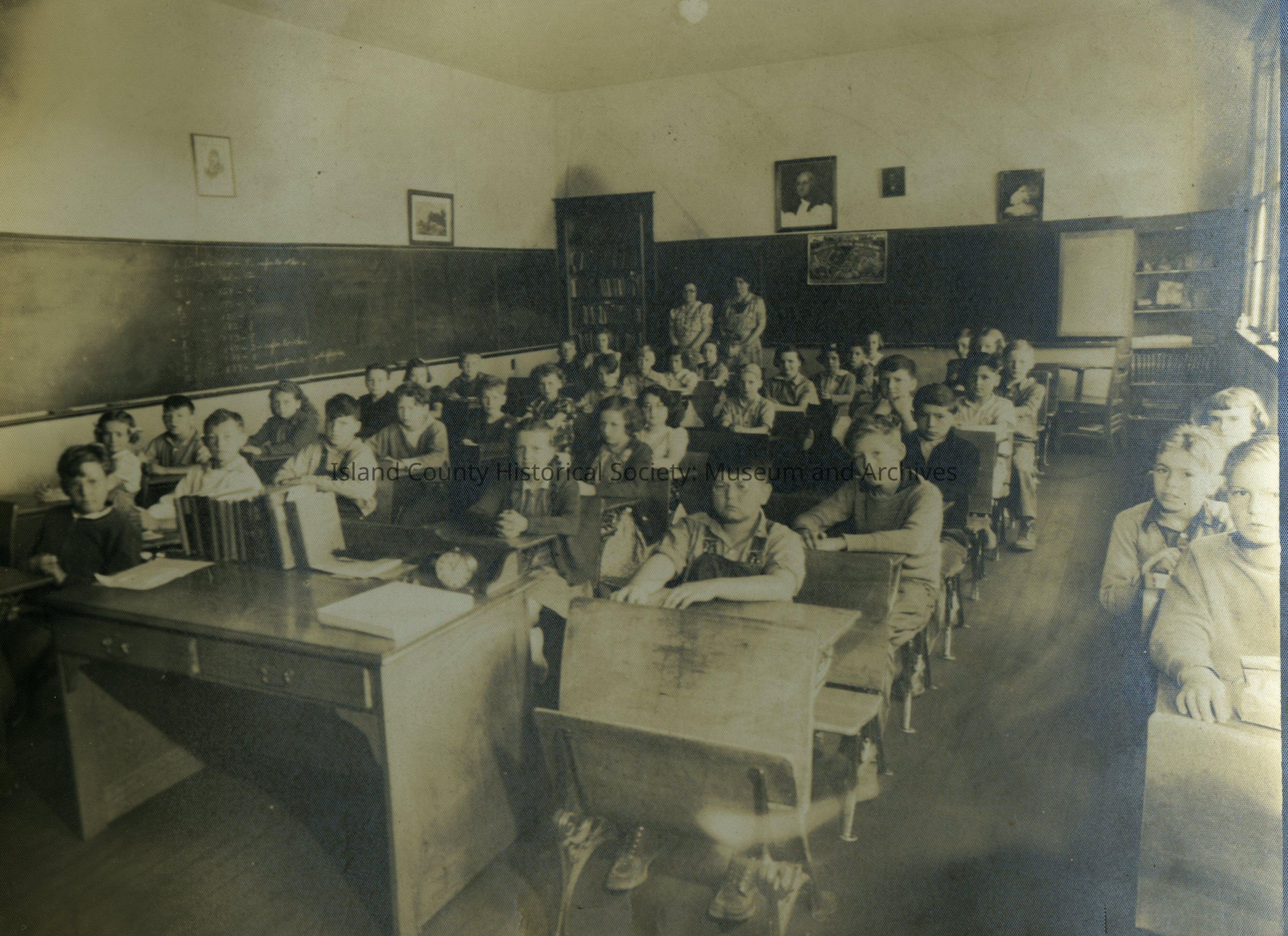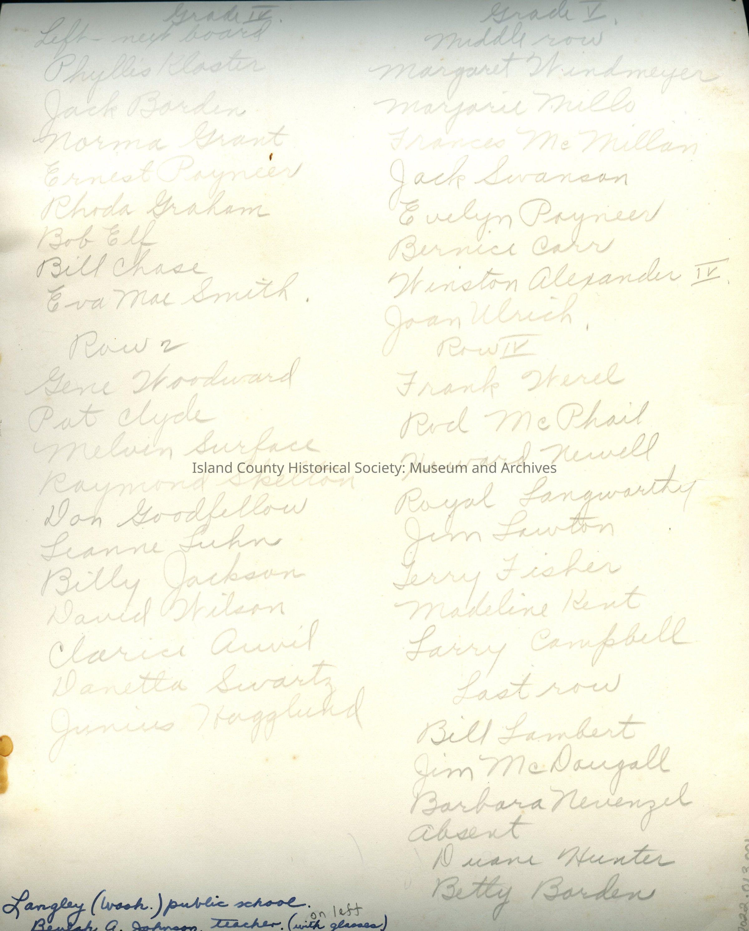 A photo of children sitting in the Langley School at their desks. Class is being taught by Beulah Johnson. List of students written in pencils on the back. Date is estimated to be around 1940.Photograph Details