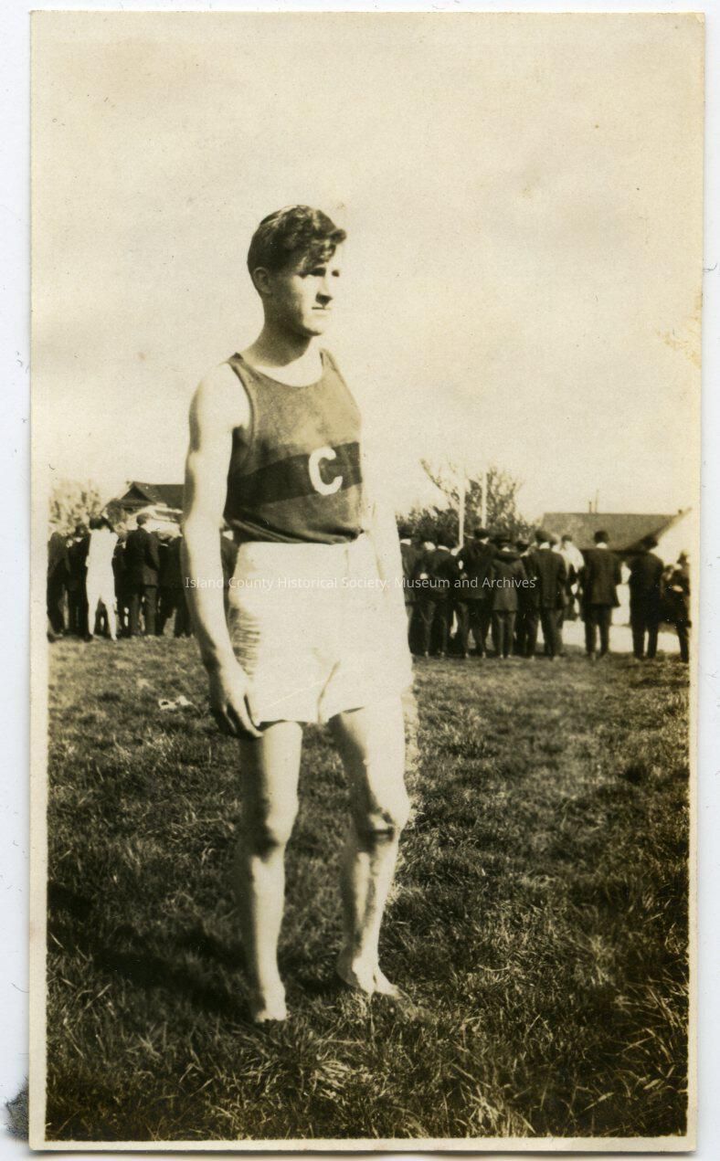 Photo of a young man, sporting/racing clothes of tank top and shorts; top has a "C" on it. On the back: Russ