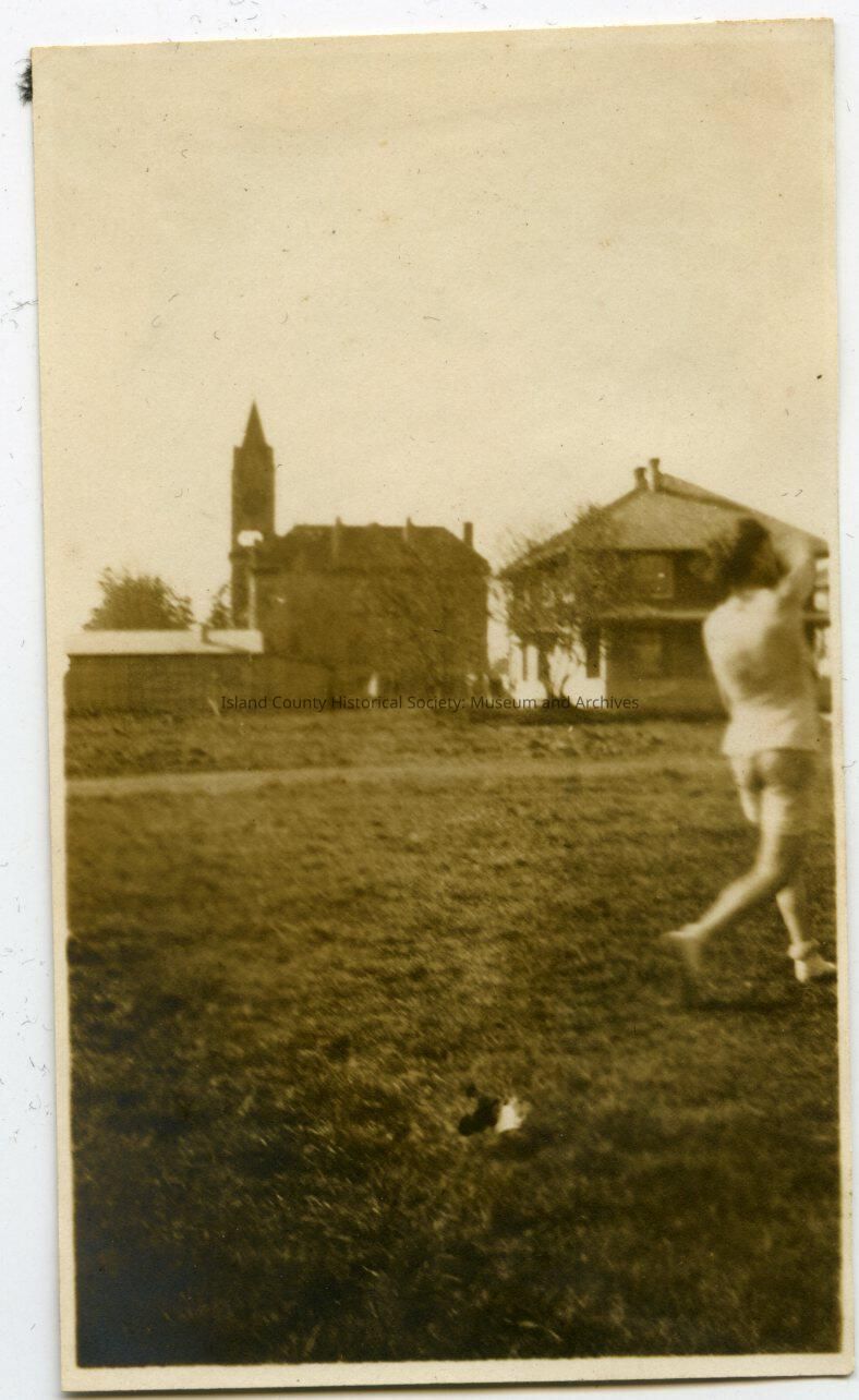 Photo of a young man, sporting/racing clothes of tank top and shorts; threw something; church and house in background. On the back: Roy throwing discus