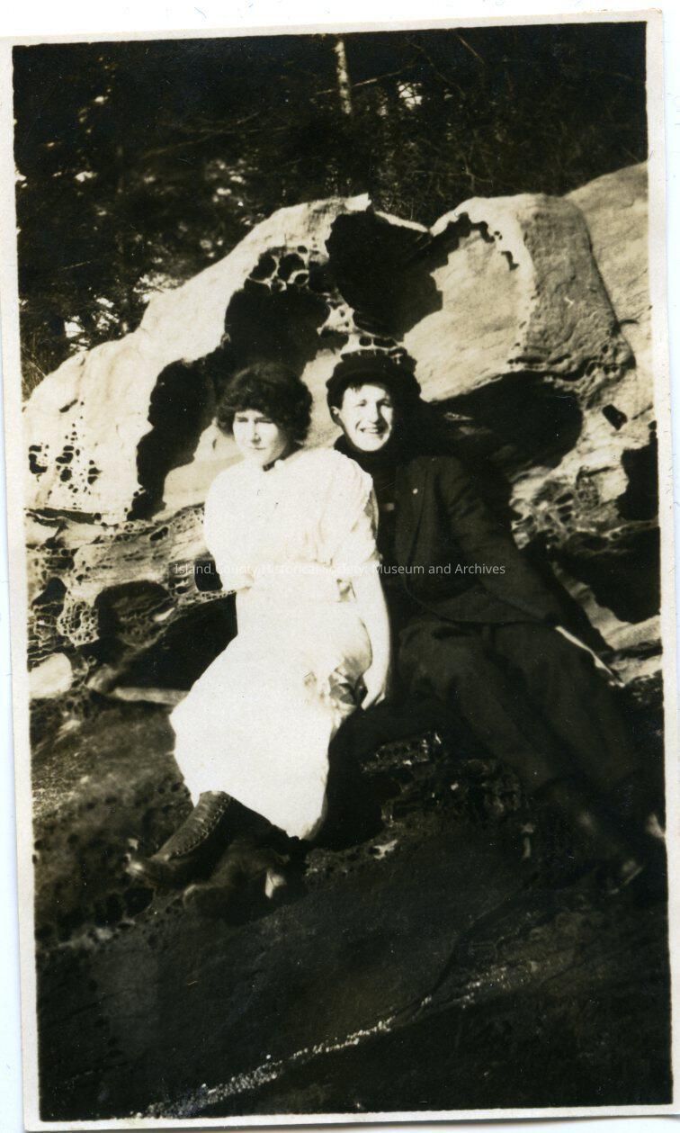 Photo of a young man and young woman sitting next to a large rock. She has a light dress. He is wearing a hat and jacket and sweater with a "B" on it. On the back: 1913-14 Madeline & Russ