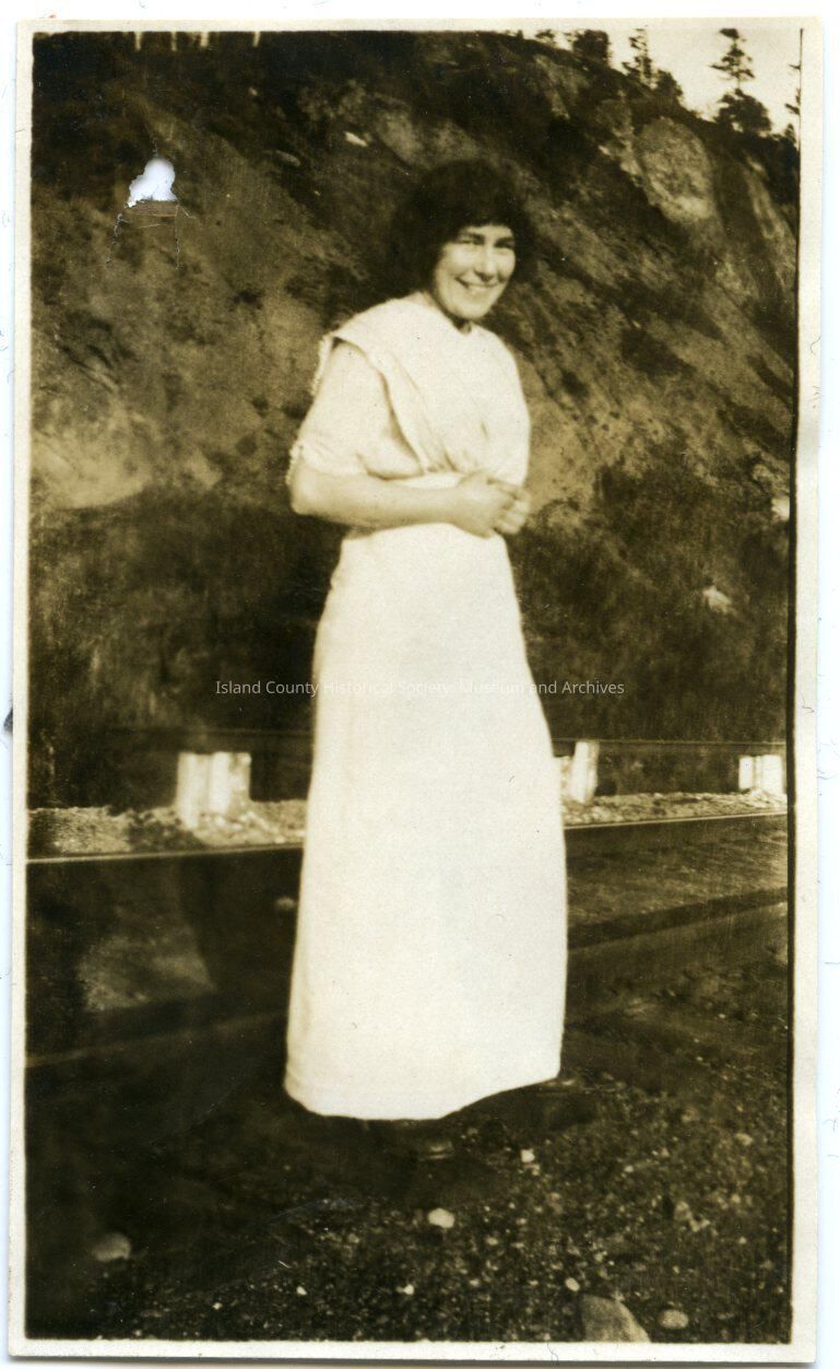 Photo of a young woman wearing a light dress, standing in front of a bluff. On the back: Mad (Madeline)