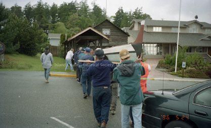 A color negative of a group of men carrying one of the canoes to the boat shed. They are across Alexander Street carrying the canoe directly into the boatshed. The canoe is painted red in the front and white on the back on the top and pale blue on the bottom. The negative is timestamped '96 5 24. Written on the envelope with the negatives and photos: moving canoes cedar wheel - Deception Pass 6/96.