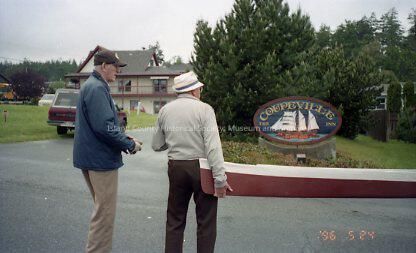 A color negative of two men inserting one of the canoes to the boat shed. The canoe is painted red in the front and white on the back on the top and pale blue on the bottom. The negative is timestamped '96 5 24. Written on the envelope with the negatives and photos: moving canoes cedar wheel - Deception Pass 6/96.