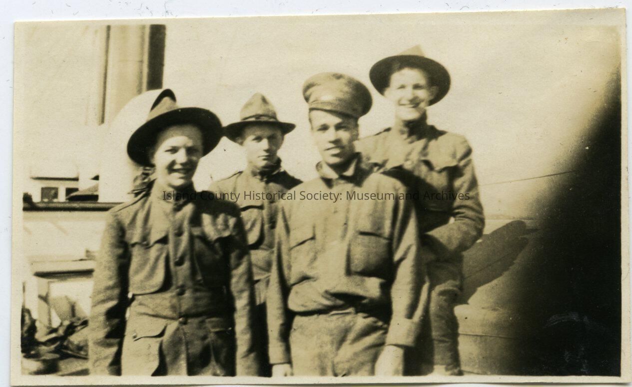 Photo of young men in uniform, on a boat, probably a ferry.