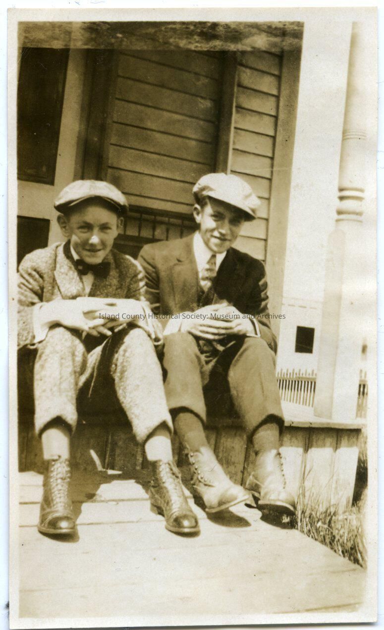 Photo of two young men in suits and caps sitting on a porch. On the back: Rex Harper, Dallas Sivert