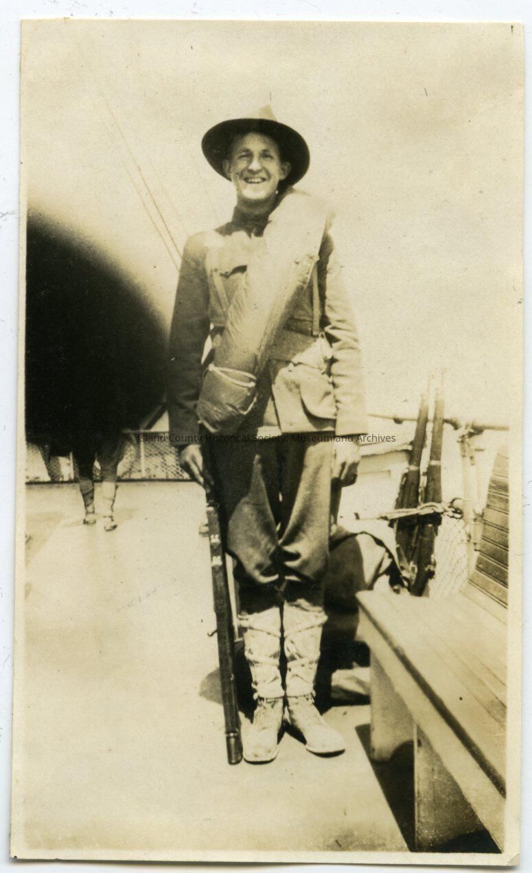 Photo of young man in uniform, standing beside a large covered gun battery. On the back: East Sound Mounted Police, National Guard of Finnland (sic)