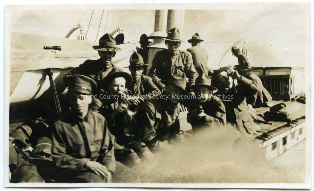 Photo of young men in uniform, on a boat, probably a ferry. On the back: Dodd, Hienie, Lysle Campbell