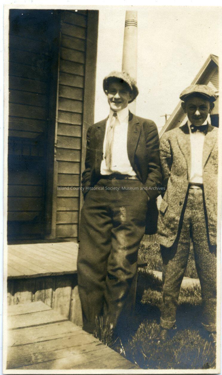 Photo of two young men in suits and caps standing beside a porch. On the back: Russ & Rex