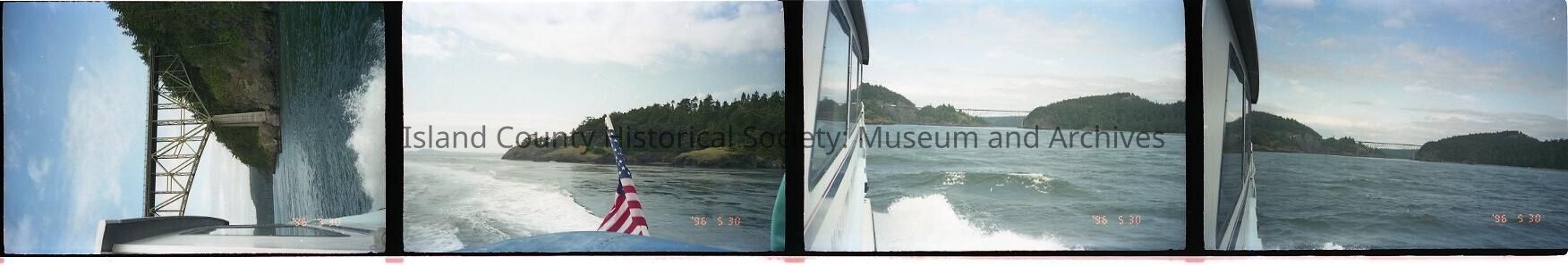 A strip of 4 color negatives taken from a boat in Deception Pass and looking up and back at the bridge. The negative is timestamped '96 5 30. Written on the envelope with the negatives and photos: moving canoes cedar wheel - Deception Pass 6/96.