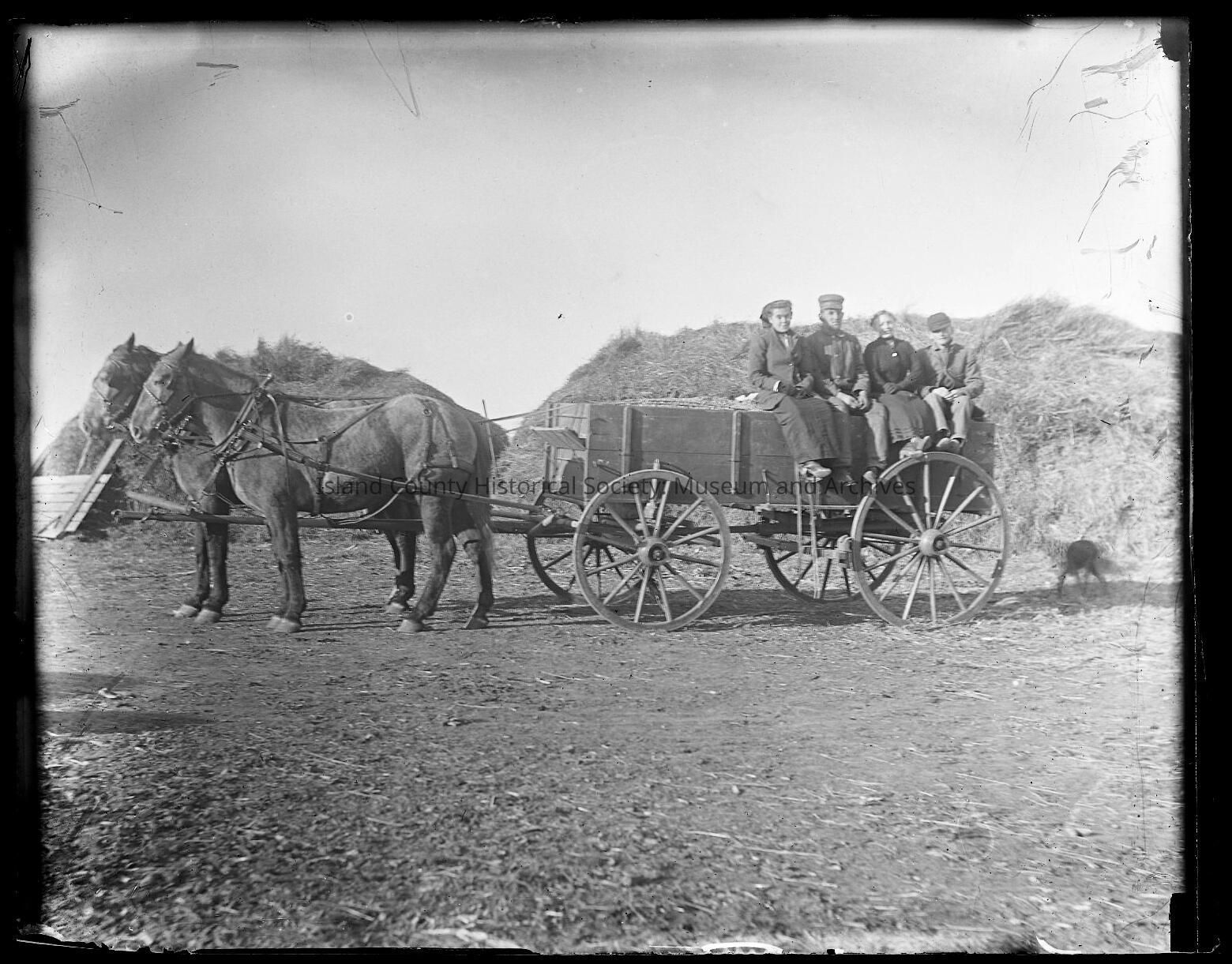Two horses (Mabel and Maggie?) pulling cart with passengersCollection