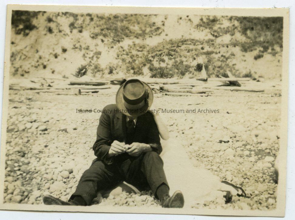 Photo of a young man in a suit and hat, sitting on a beach and looking at the ground. A young woman is sitting beside but hiding behind him.