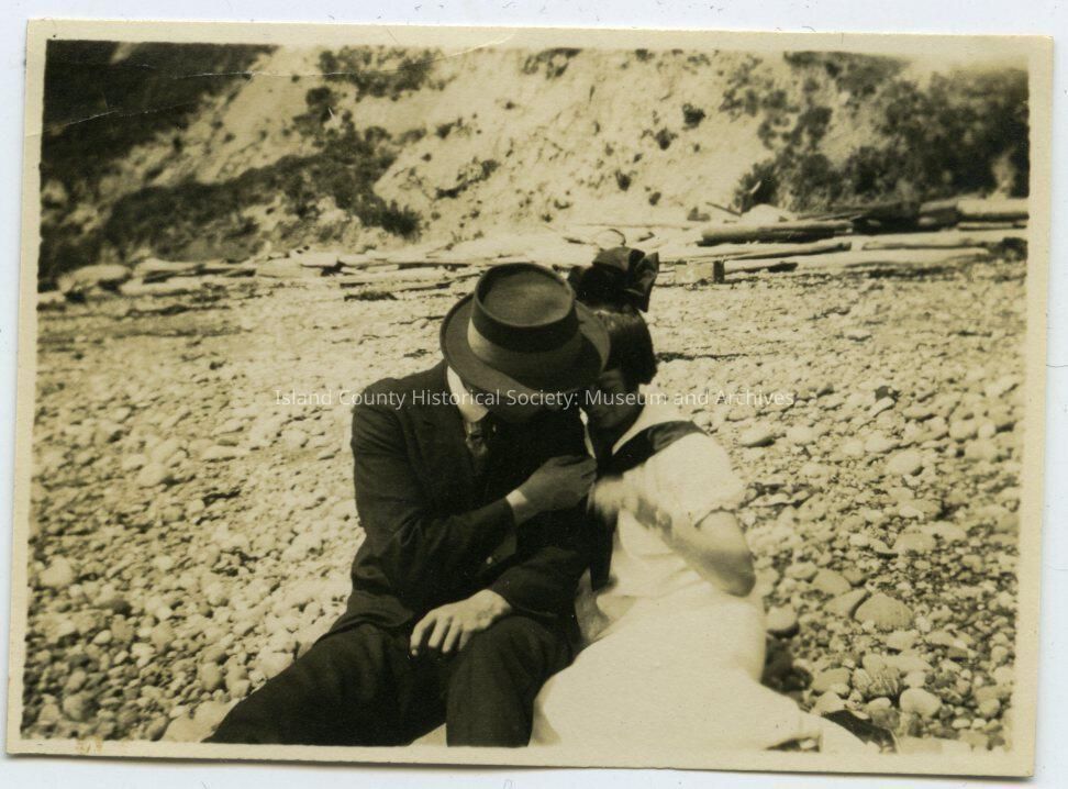 Photo of a young man in a suit and hat, sitting on a beach and looking at the ground. A young woman is sitting beside him.