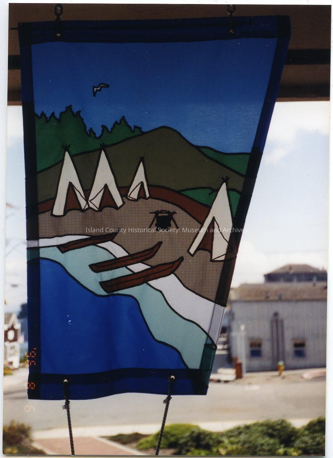 A color negative (part of a negative strip) of a banner hanging on the front porch of the ICHS museum. It is a beach scene with three canoes on the shore with four teepees and a cooking pot over a fire with a hill and seagull.