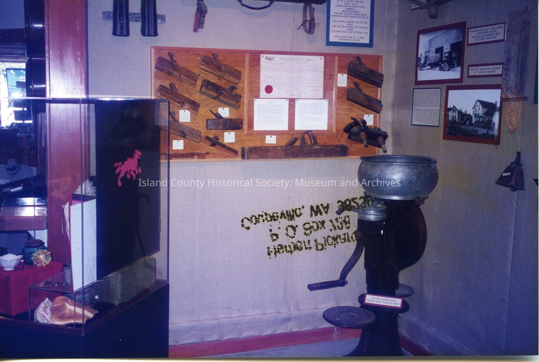 A color photo of the ICHS Museum exhibit with a cream seperator, and on the board are planes and other tools. Stamped on the back: Herbert Pickard