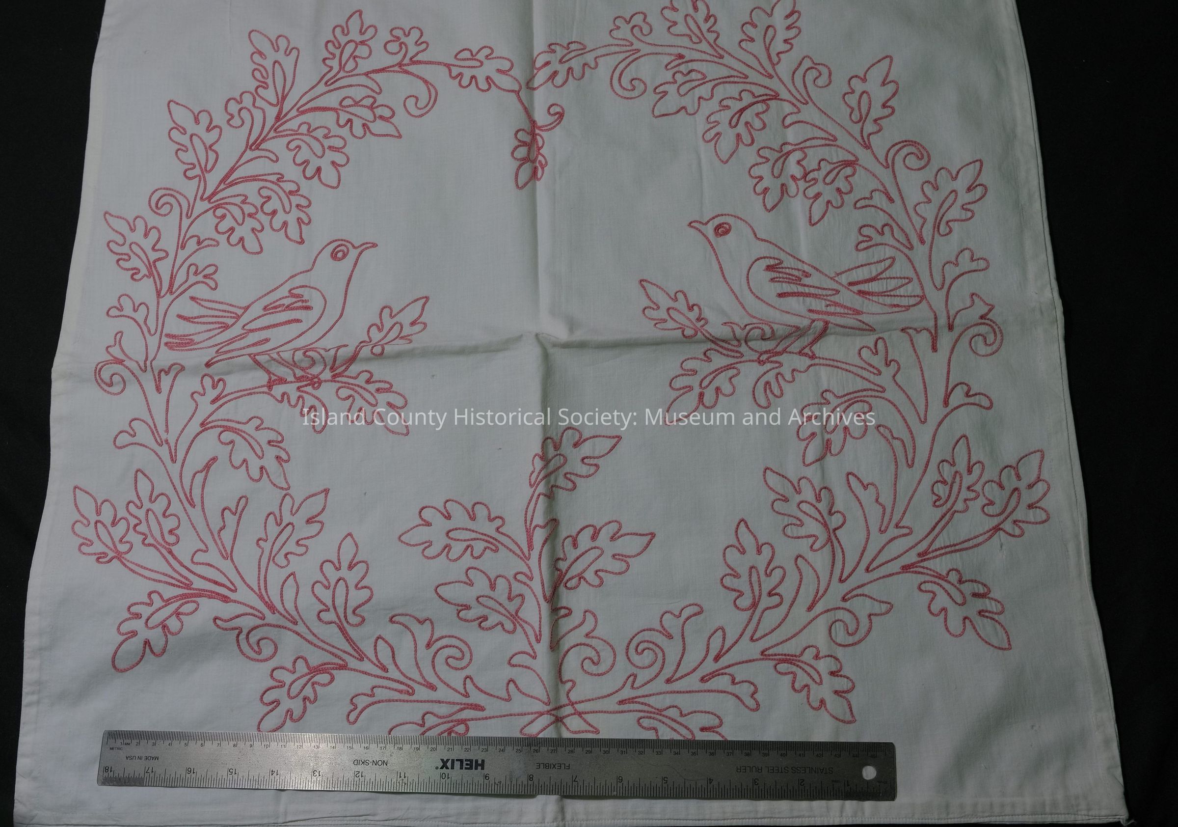 White cotton spread 36" x 36" machine worked design in red flowers and birds.