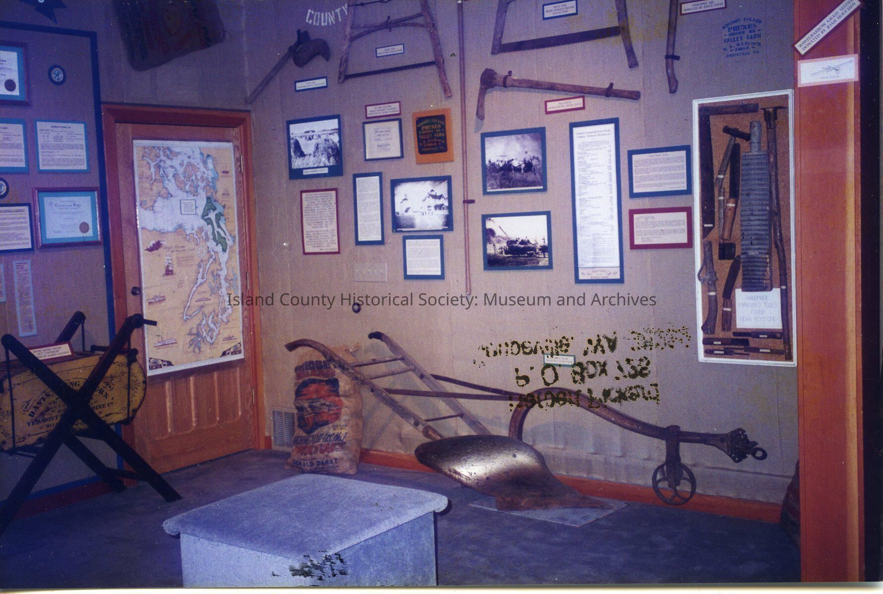 A color photo of the ICHS Museum exhibit with a farm tool and other tools above the pictures on the wall. There is a map on the door. Stamped on the back: Herbert Pickard