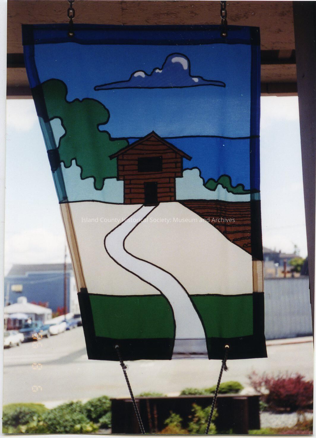 A color photo of a banner hanging on the front porch of the ICHS museum. It is a bluff or cliff scene with plowed fields, trees and clouds. Written on paper attached to the negative strip: museum banners. Timestamped '96 8 6