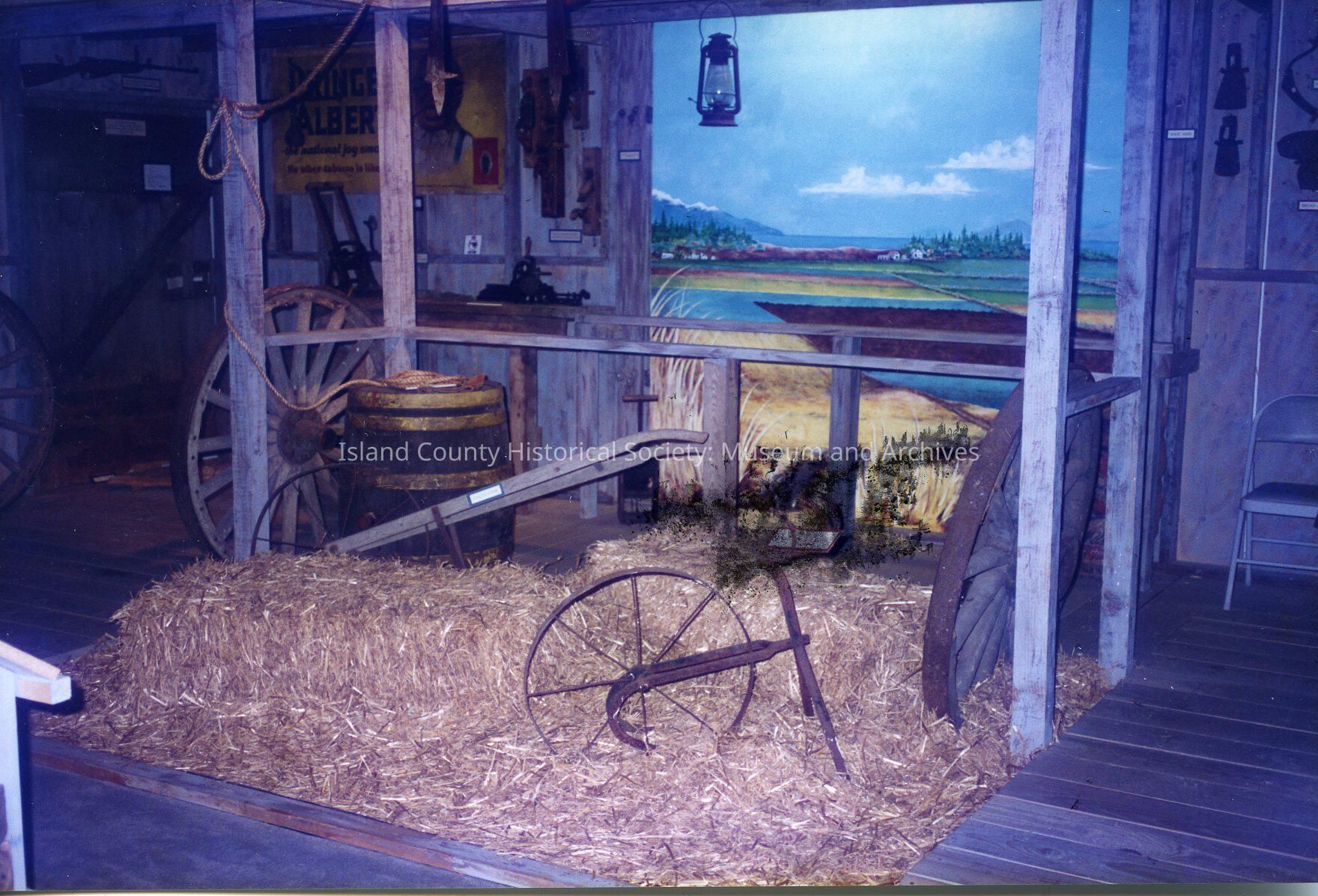 A color photo of the ICHS Museum exhibit with hay below and a tool in the middle. There is a light hanging in front of a painting of the blue sky and land below. Stamped on the back: Herbert Pickard