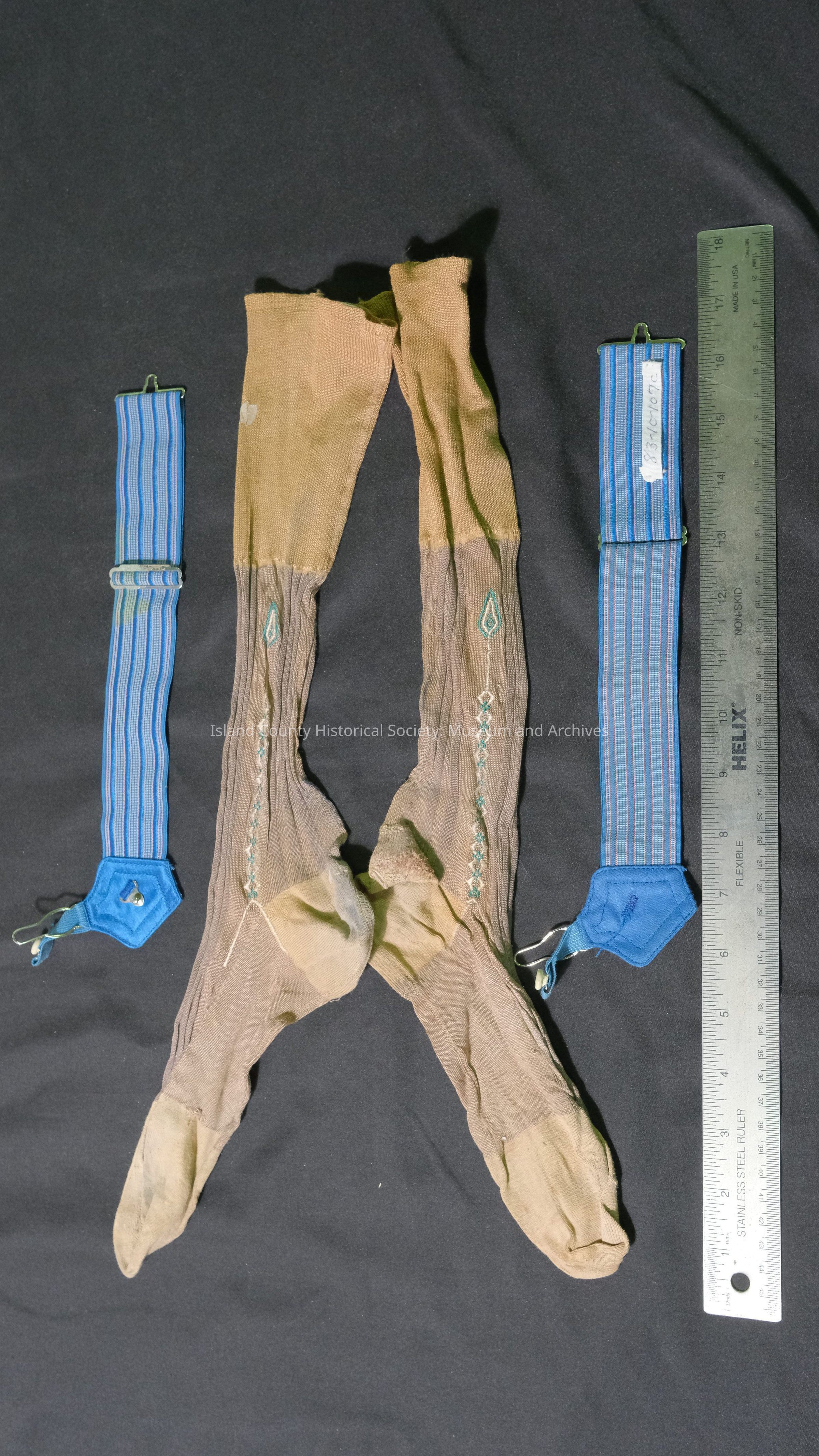 Tan men's socks, rayon, blue men's garters, belonged to Dorothy Dickey.