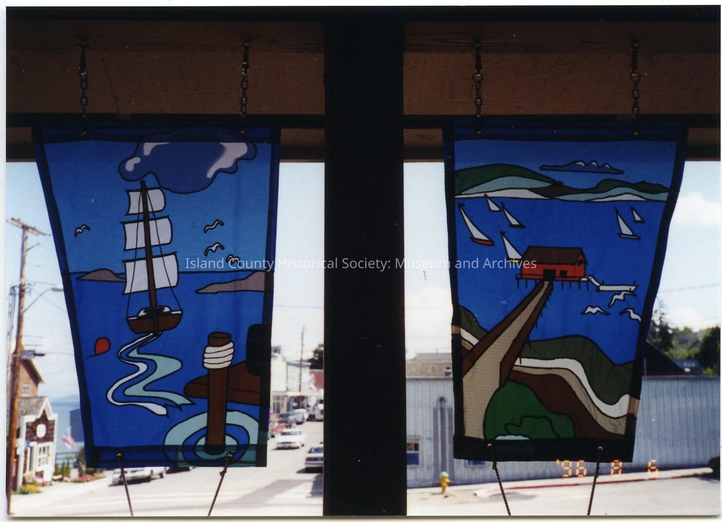 A color photo of 2 banners hanging on the front porch of the ICHS museum. On the left is a scene with a sailing ship with three sails and part of a wharf. The other banner is a beach scene with the Coupeville Wharf, sailboats and seagulls.