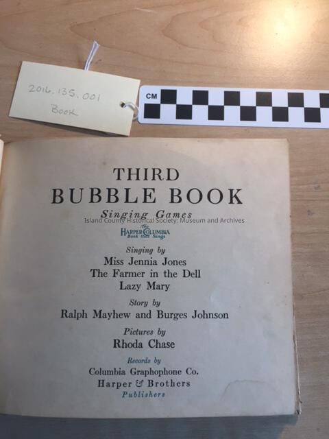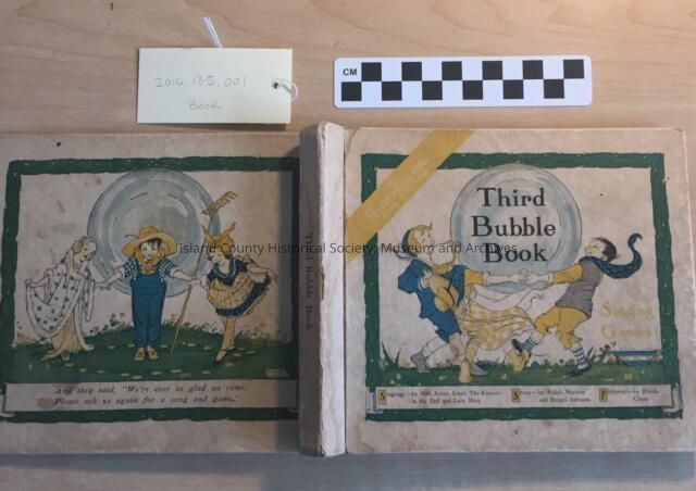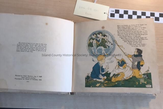 A childrens paper bound story book with color drawings, story, and three record slots with records (to be accessioned as a, b, c). Arly G. Ostling's childhood playthings. Circa 1917.