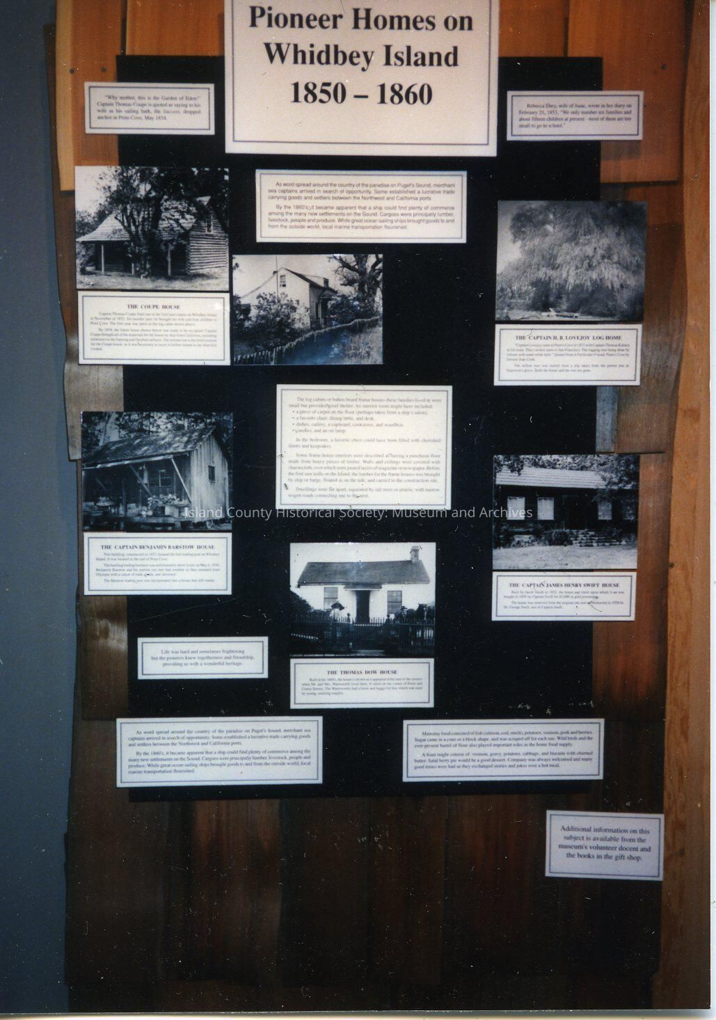 A color photo of the ICHS Museum exhibit of a wall with a sign that says "Pioneer Homes on Whidbey Island 1850 - 1860, with pictues of homes and writings about them. Written on the back: Apr 19, 1992
