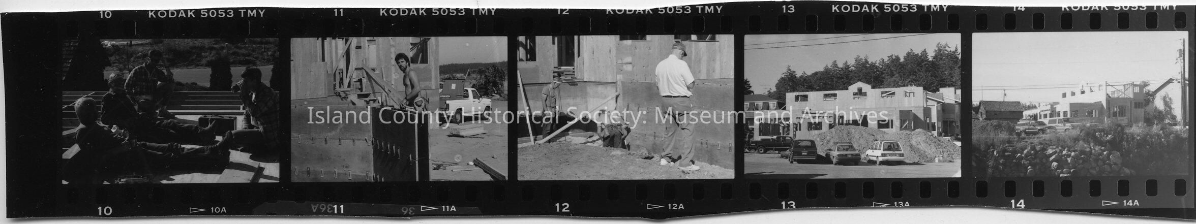 A black and white contact strip with 5 frames of the construction of the new ICHS museum in Coupeville. Frames as follows: