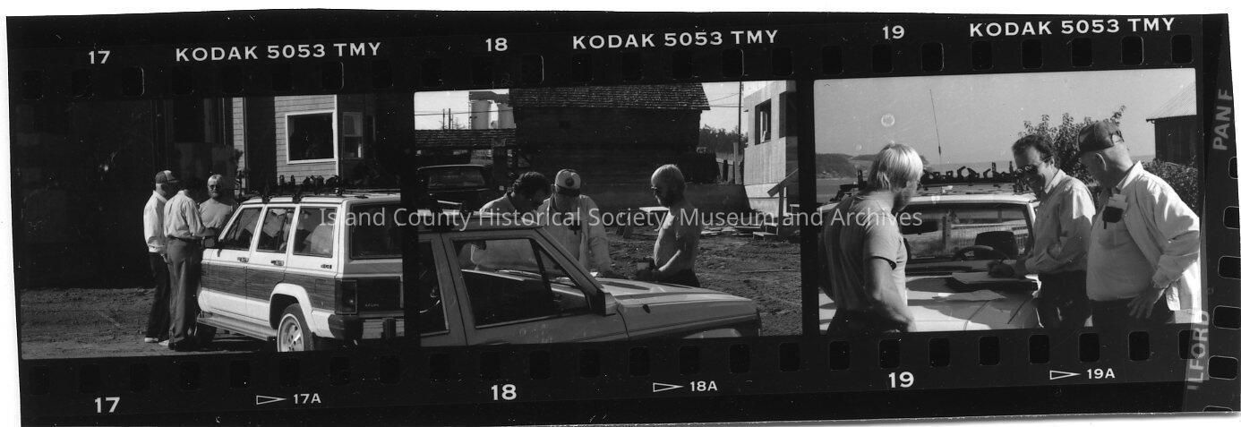 A black and white contact strip with 5 frames of the construction of the new ICHS museum in Coupeville. Frames as follows:
