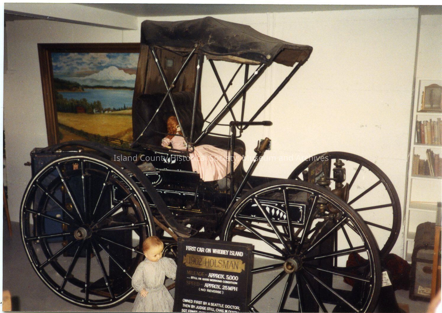 A color photo with of the Holsman car in the ICHS museum. Two dolls are with it - one on the seat, the other standing beside the sign with details about the car. There is a painting on the wall behind the car. It is probably in the old museum.