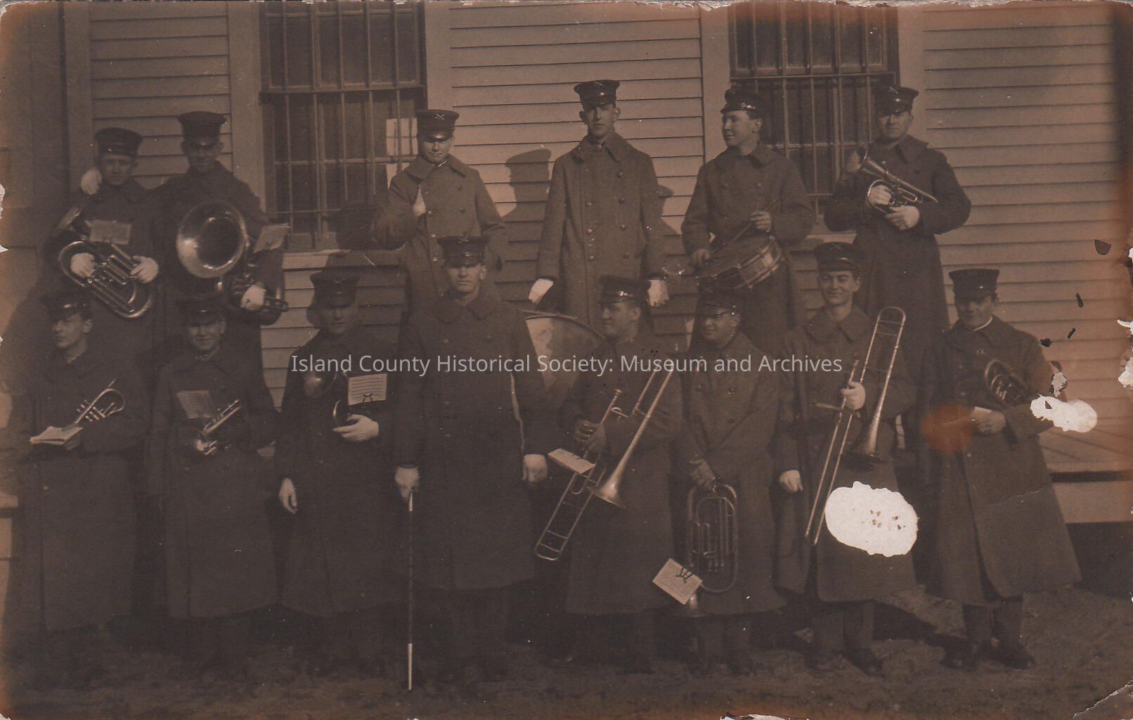 Military Band. Eight men in the front and six standing behind them. The postcard is from the Fort Casey colleciton.