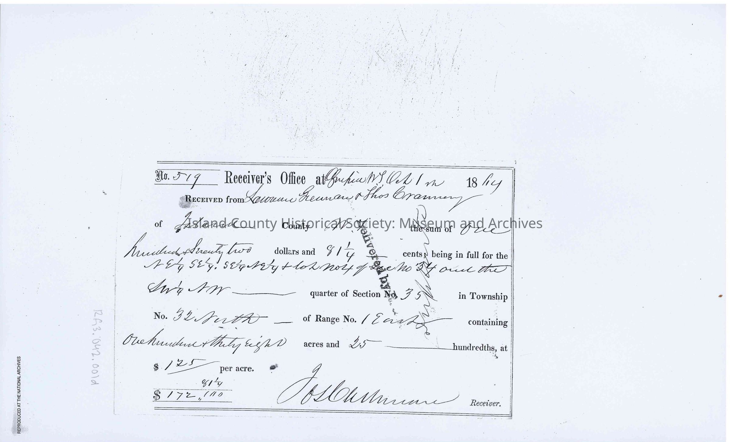 Photocopy of a cash entry/confirmation of payment on land plots in Section 35 in Island County, paid by Thomas Cranney and Lawrence Grennan, c. 1864, for the sum of $172.00.Collection