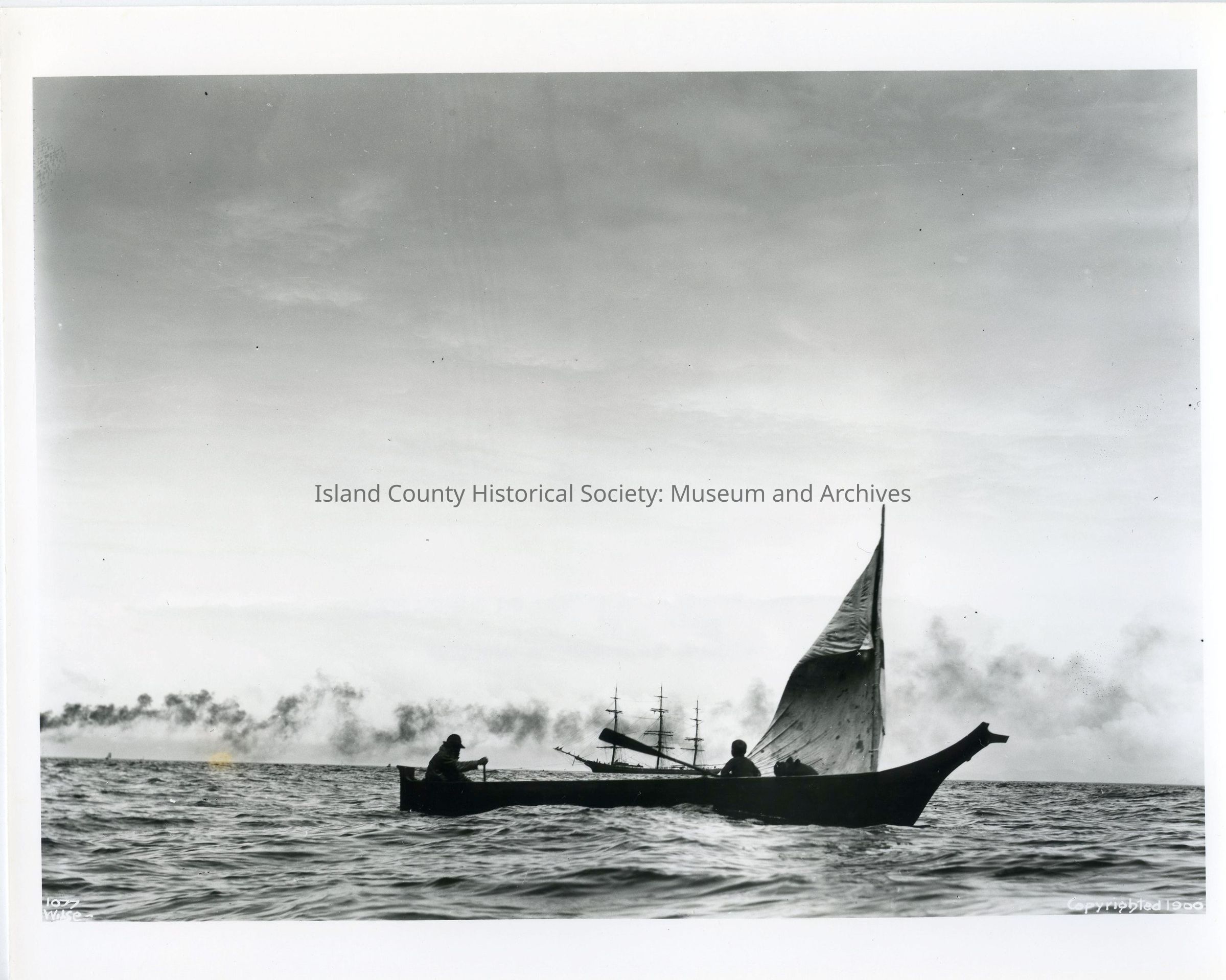 Photograph of a Makah canoe and two passengers (foreground) and a small ship (background), c. about 1900. Credit: Museum of History and Industry.Photograph Details