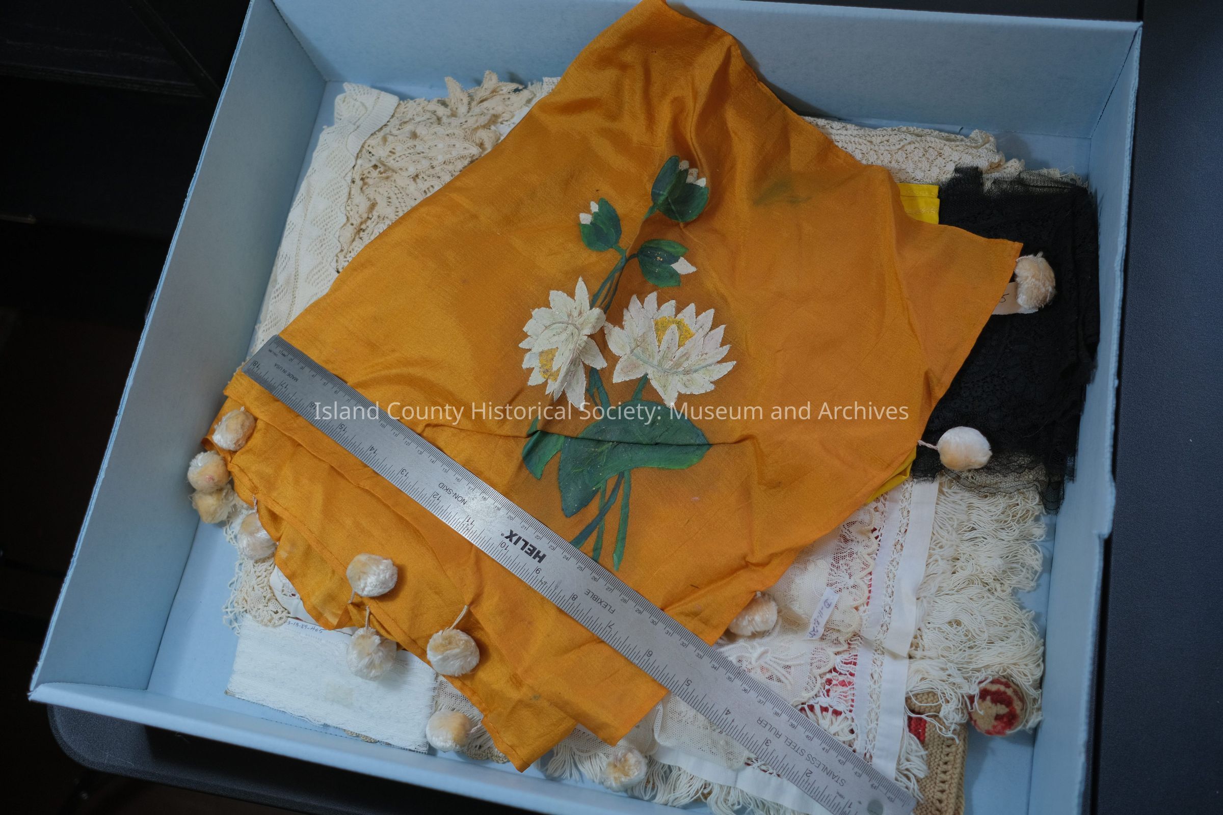 429 - gold/orange piano scarf w/ handpainted white/yellow flowers (oil paint)