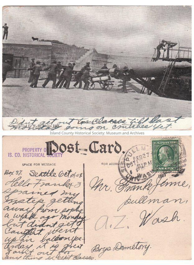 Message: "Hello Frank, I sprained my instep getting away from (undecipherable) a week ago Monday but didn't get caught. Went up in bal(undeipherable) yesterday it is great. I ain't out for anything except classes. Didn't get out to classes till last Monday going on crutches yet. Boys Dormitory"Made/Created