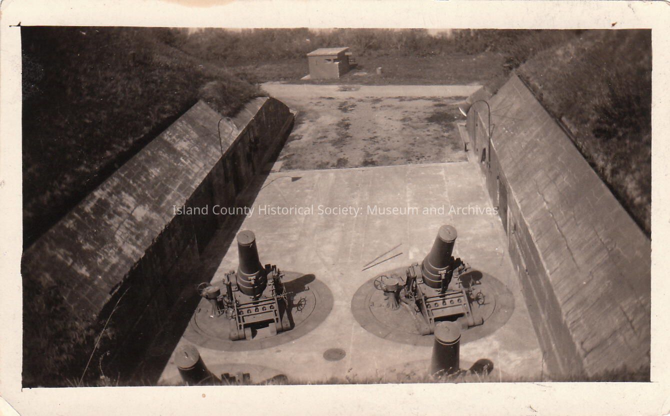 Ft Casey, Mortar Pit. All original mortars were Model M189 MI mounted on Model M1896 MI carriages. Battery construction (Seymour and Schenck) commenced 1898, date of transfer for both June 16, 1902. In the background is the data/telephone booth. This received firing data from the ploting room, posted on boards and slide the boards outside (right side of booth) so the mortar crews could determine shell weight, powder weight and zone needed to load the mortars. Mortares #1&2 (front) were fired at different angles than mortars #3&4 (back) in order to avoid contatc at the apex firing angle. The camera while pointing down was facing an eastern direction.