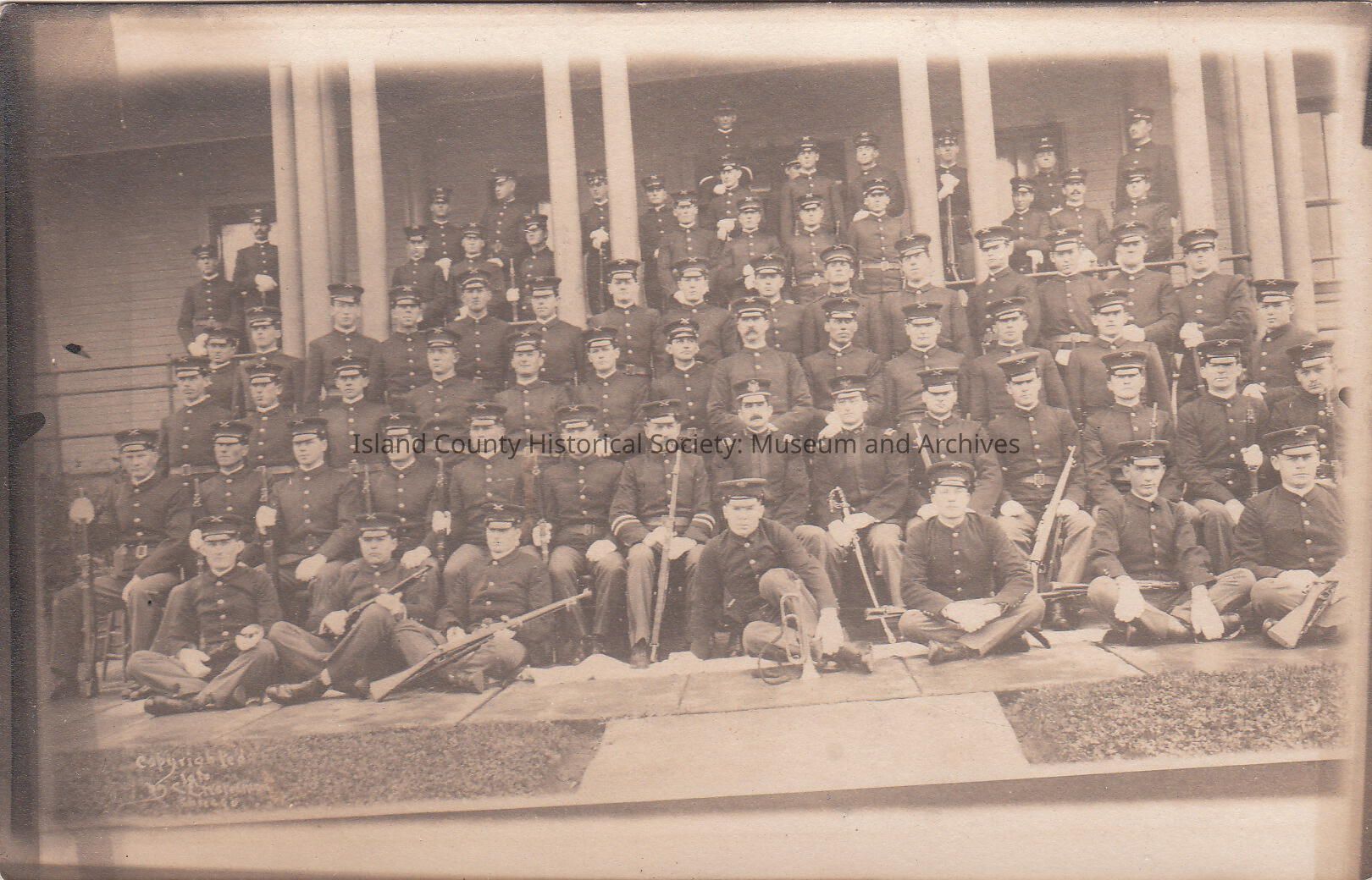 Large Group Portrait in Uniform sitting or standing on porch steps. Sidewalk in front. Columns on porch. Some have rifles, one man a sword, one with a musical instruments - bugle. Possibly Fort Casey.