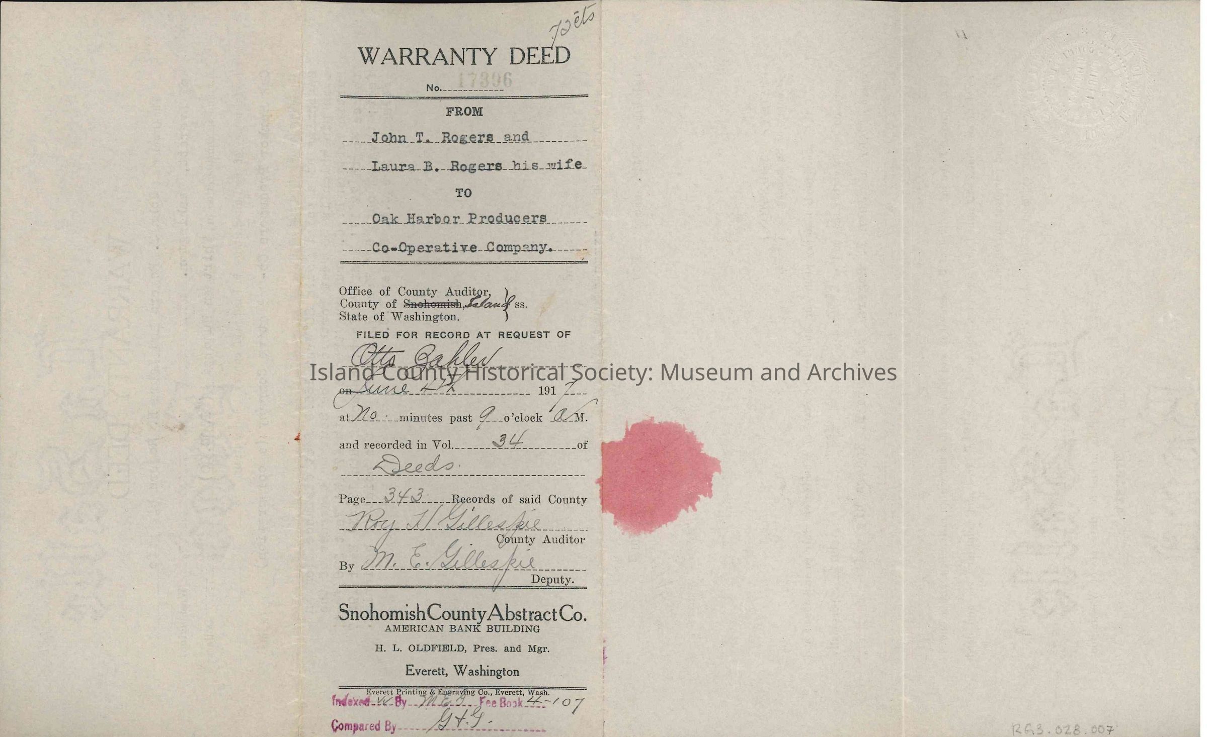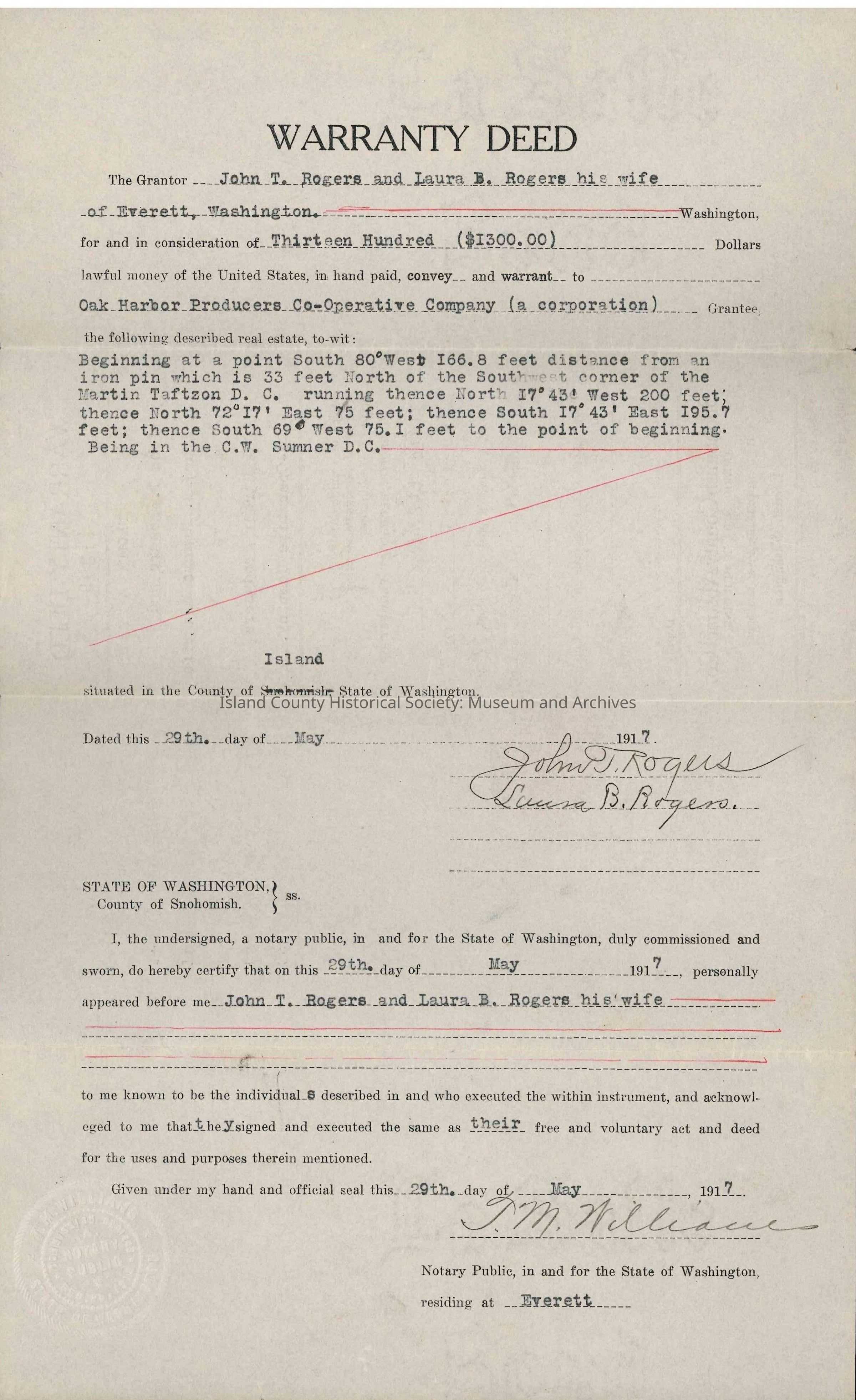 Warranty Deed from John T. Rogers and Laura B. Rogers to Oak Harbor Producers Co-Operative Co., c. 4th June 1917.