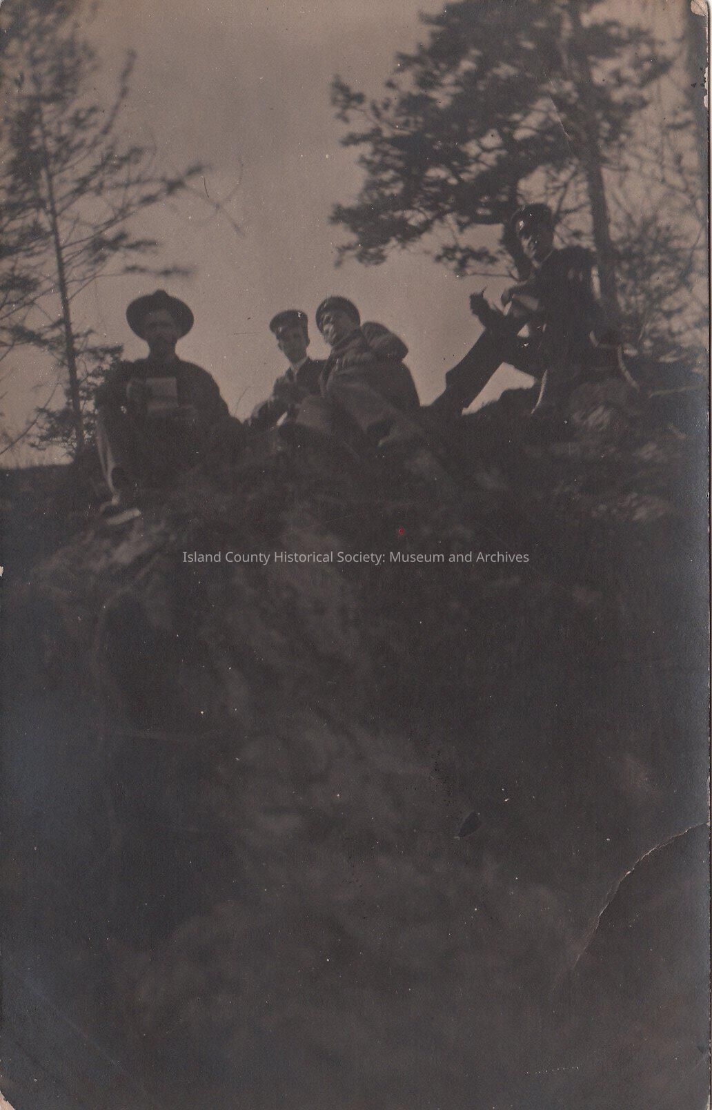 Four soldiers sitting on small cliff. Trees behind them. AZO postcard issued: 1904-1918.