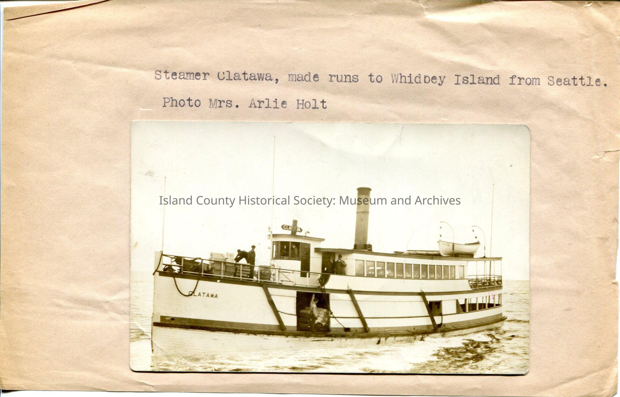 A photo of a steamer in the water. There is a small lifeboat on the back, upper deck of the steamer. There are about 6 men visible in the photo, all on the steamer. The name of the steamer is painted on it--"Clatawa". The photo is on a piece of paper and the paper says, "Steamer Clatawa, made runs to Whidbey Island from Seattle. Photo by Mrs. Arlie Holt".Made/Created