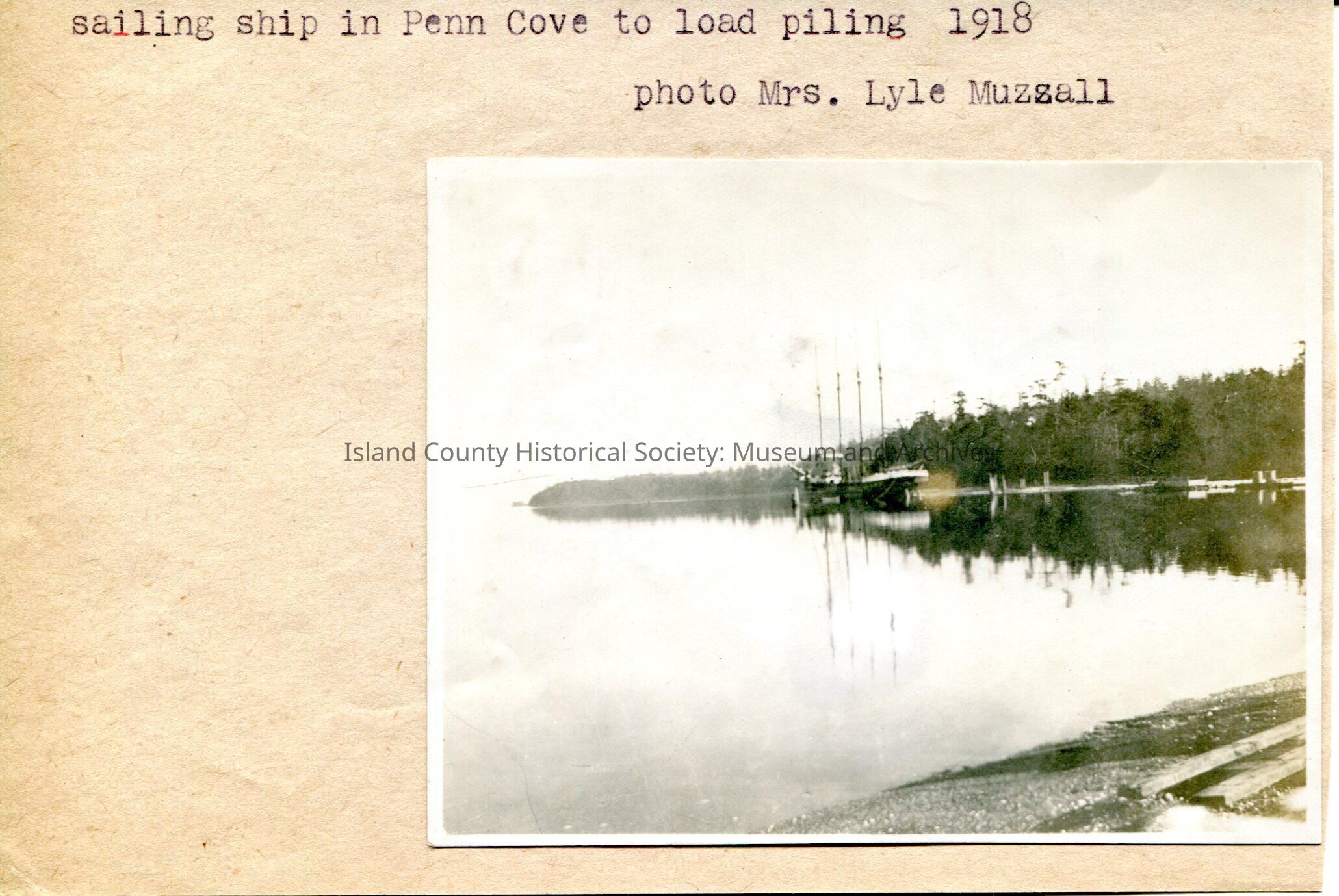 A photo of a large boat close to a rocky shore. There are no people visible in the photo. The photo is on a piece of paper and at the top of the paper it says, "Sailing ship in Penn Cove to load piling 1918, photo Mrs. Lyle Muzsall".