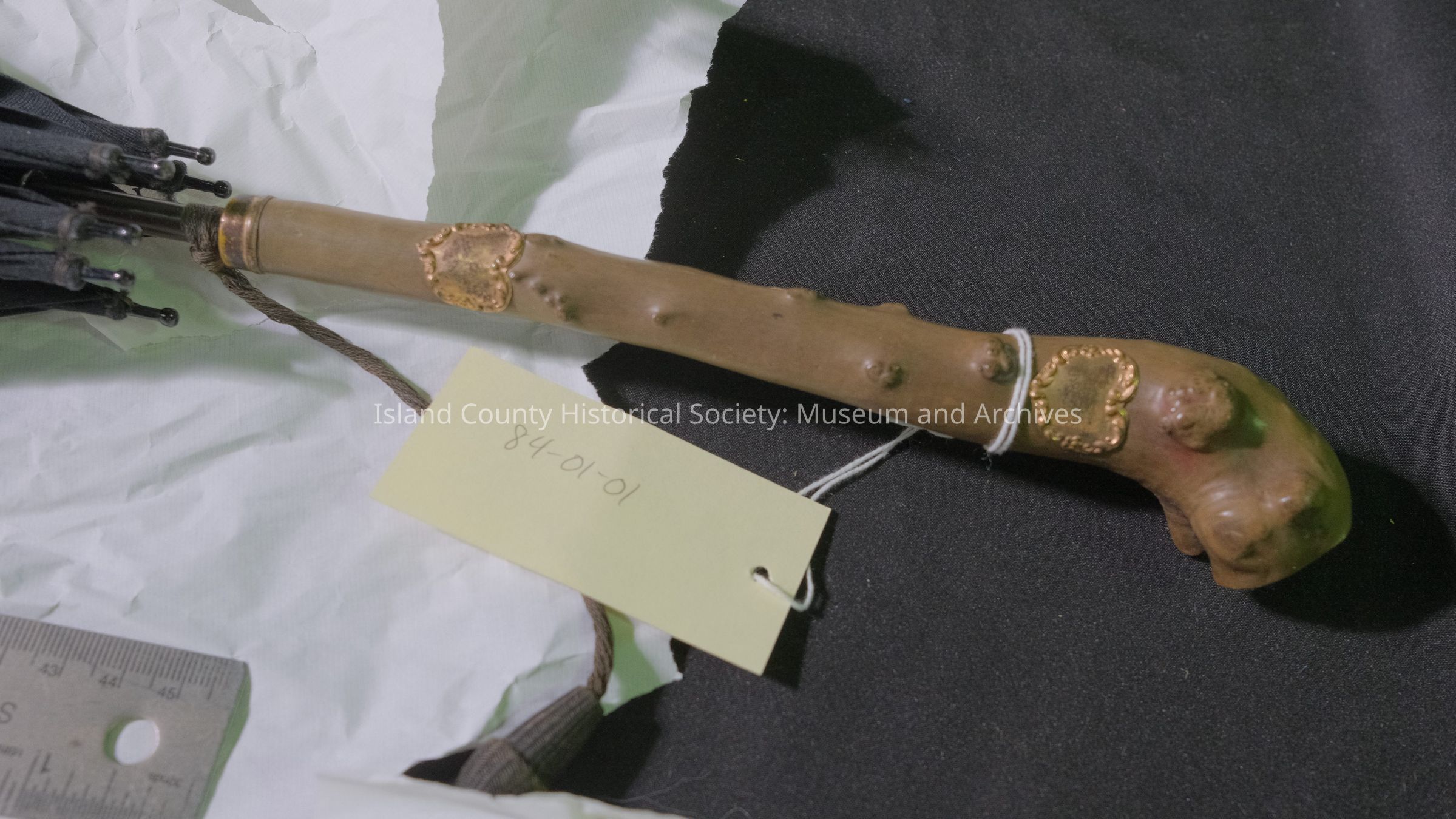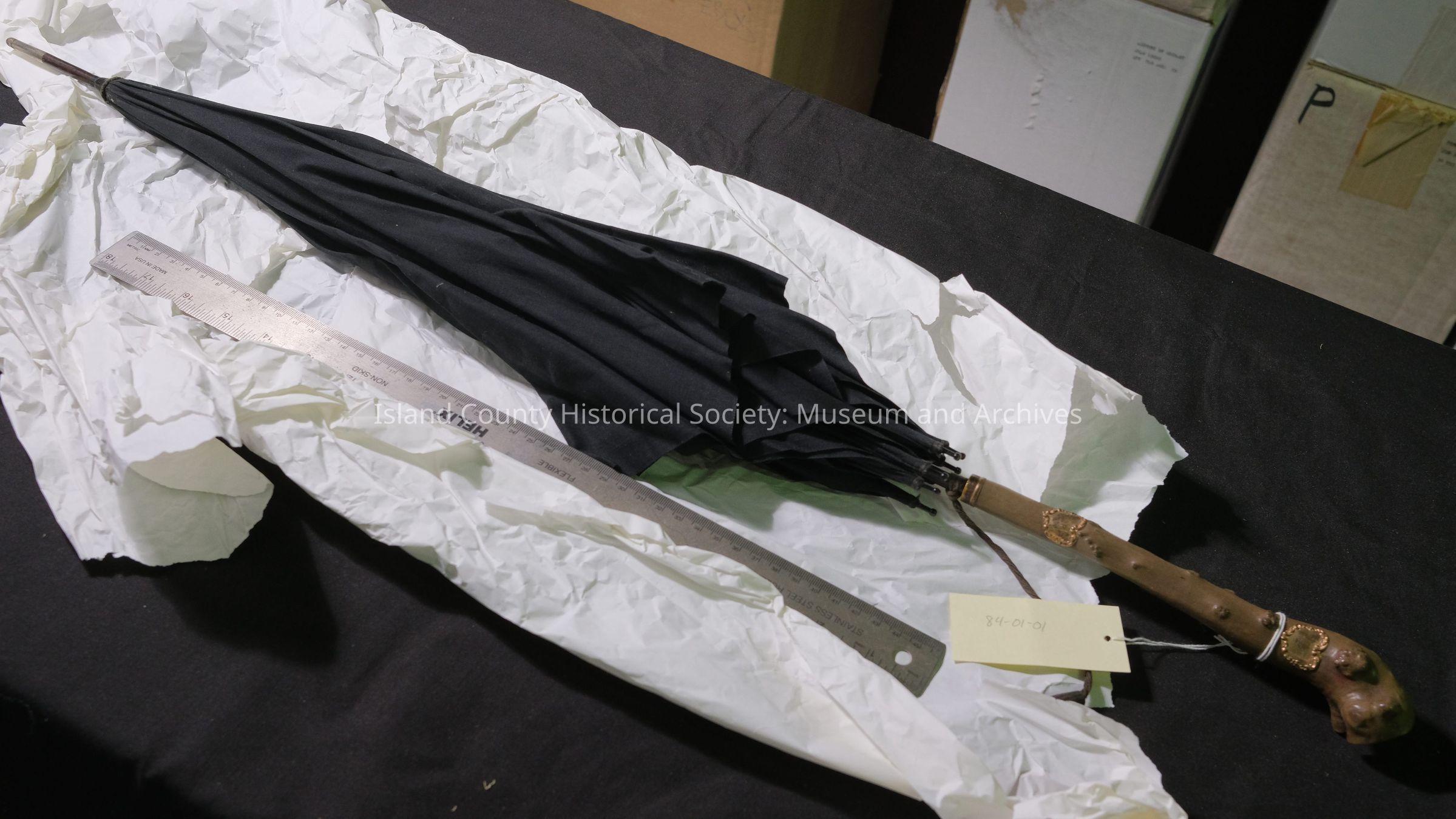 Umbrella, ornate handle, black cloth.