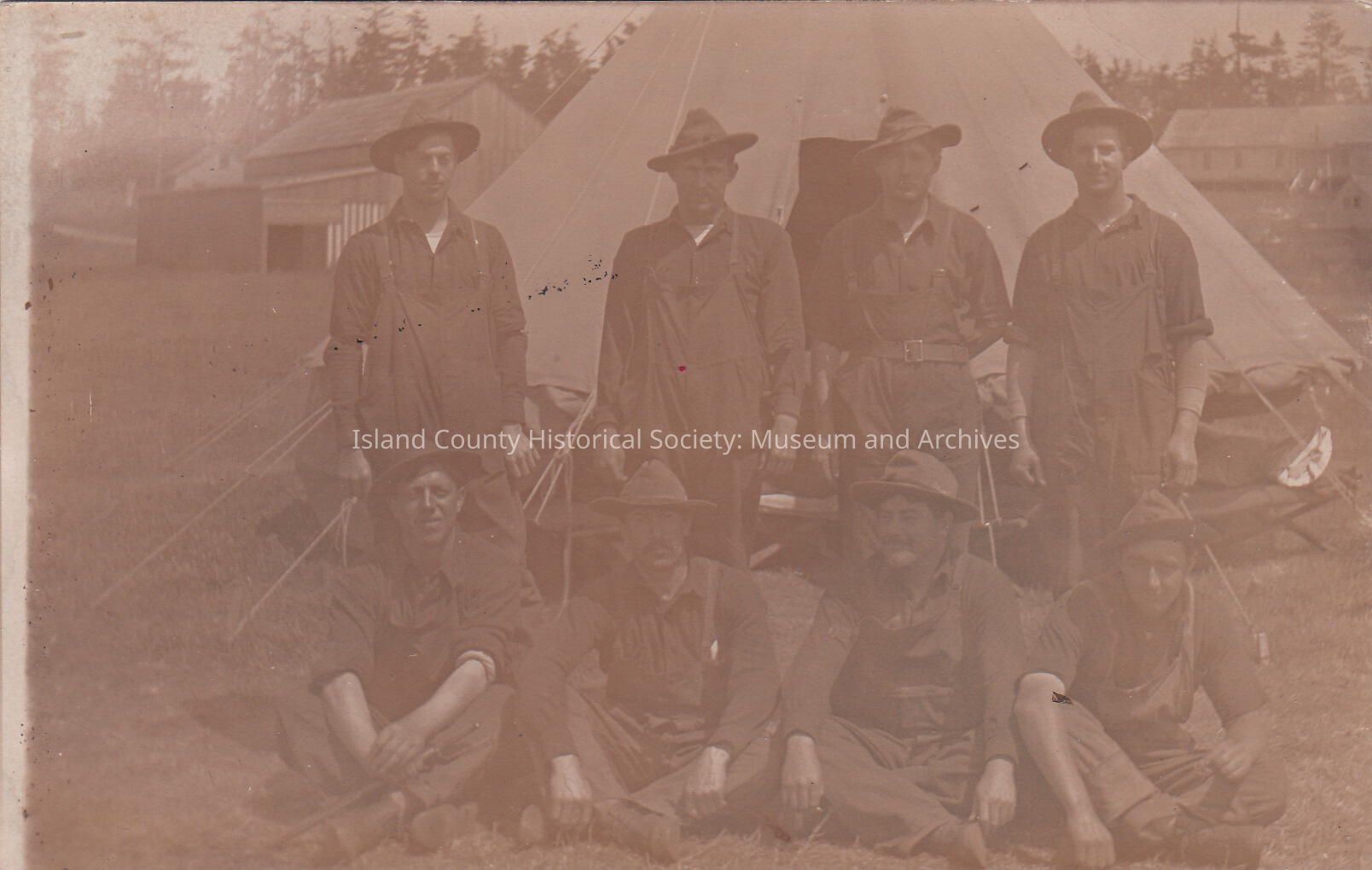 Eight soldiers in front of a tent. Barn or warehouse structures in background. AZO postcard issued: 1904-1918.
