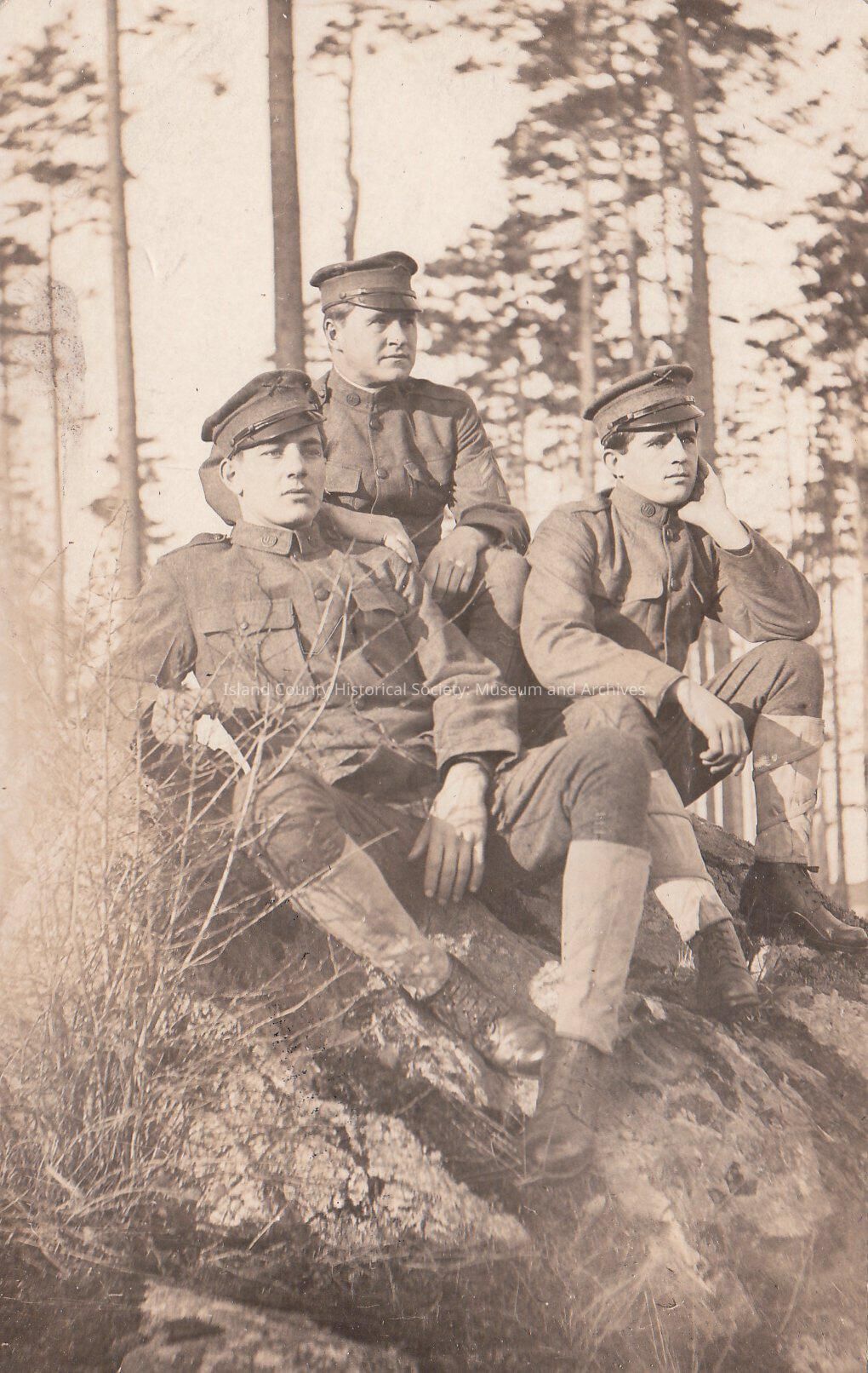 Three soldiers posing on large rock in the woods. They are wearing their uniforms. AZO postcard issued: 1904-1918.