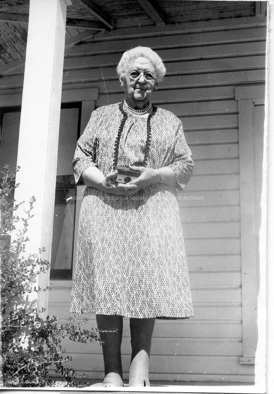 A photo of an older woman standing on a porch. Handwritten note on the front says "Gertrude (Izett) Cox from DNC..." Handwritten on the back is "Gertrude Izett Cox 1972" Izett Family Folder.